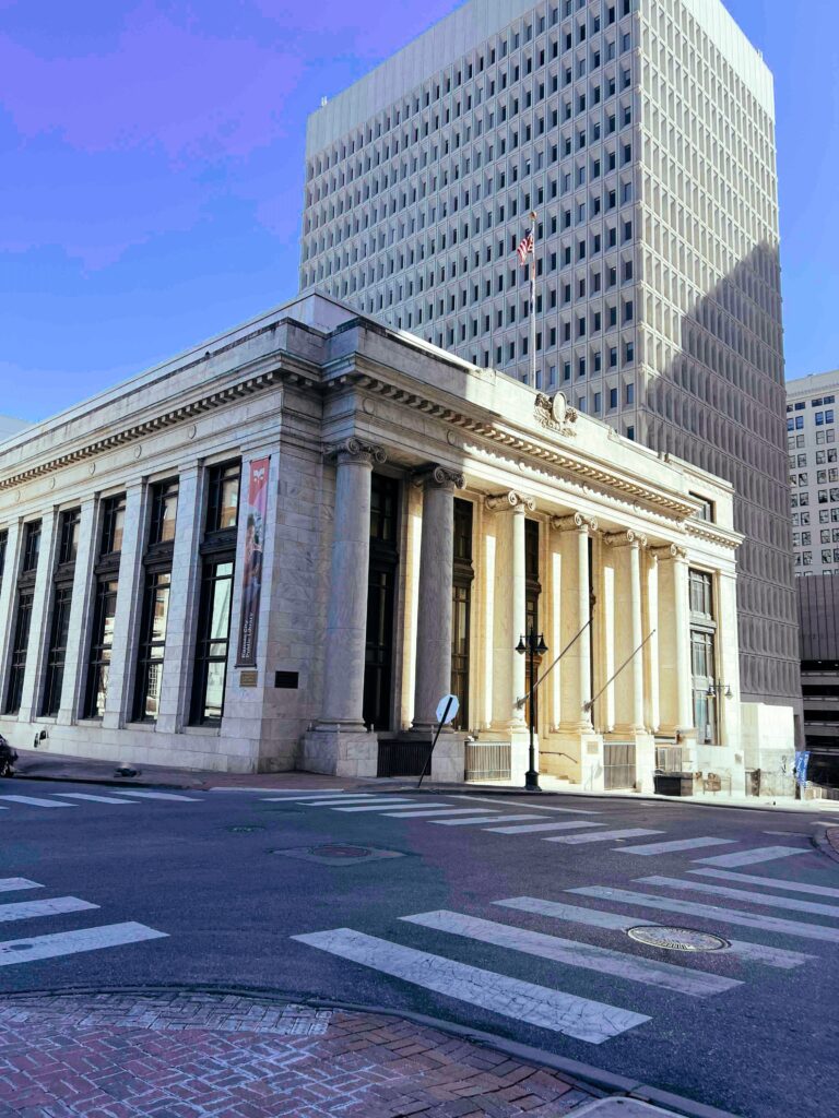 During our Library District Urban Hike, in addition to sharing the history of this building we visit the rooftop, play with giant chess pieces and get a refreshing view of the surrounding art deco buildings. We also go into the basement and experience their massive vault converted into a movie theater.